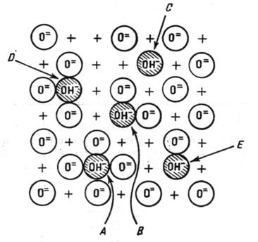 Cele cinci tipuri de ioni hidroxil difera prin densitatea locala de sarcina, tipul A fiind cel mai negativ (4 ioni de oxigen in vecinatate), tipul C fiind cel mai pozitiv (4 vacante in vecinatate), iar tipul B aproximativ neutru.