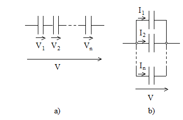 In functie de necesitati condensatoarele pot fi grupate in serie sau in paralel (Fig.2.17). Legarea in serie este echivalenta cu marirea distantei dintre armaturi. Capacitatea echivalenta a gruparii este mai mica decat oricare dintre capacitatile partiale.