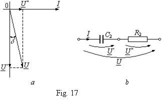 Considerand in figura 13 curentul ca origine de faza si descompunand tensiunea in componentele U' si U' (fig. 17, a), se obtine schema echivalenta tip serie din figura 17, b, conform relatiei :