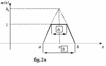 Expresia analitica a acestei functii de apatenenta se obtine simplu, observand ca trapezul din fig.a, a rezultat prin intersectia unui triunghi de forma celui din fig.1, avand inaltimea ht >1,si drepta de ecuatie m(x)=1.Astfel: