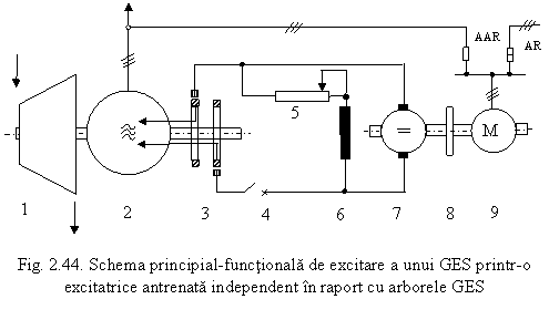 Antrenarea excitatricei printr-un motor electric dedicat permite alegerea unei turatii proprii mai reduse in raport cu turatia arborelui GES si astfel, cel putin din acest punct de vedere, se usureaza conditiile de lucru ale colectorului excitatricei. In fig. 2.44. este reprezentat principial un astfel de sistem.