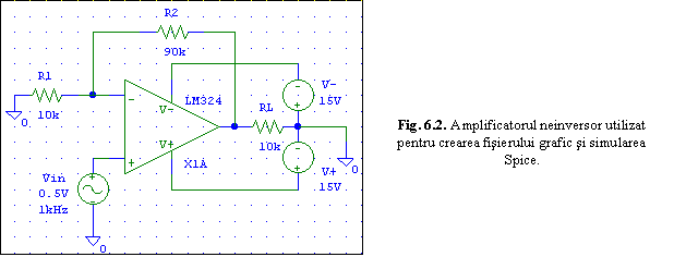 Activitatea de plasare a componentelor si interconexiunilor se face pentru urmatorul exemplu: sa se creeze fisierul grafic si sa se simuleze in PSPICE amplificatorul neinversor din fig. 6.2, realizat cu un amplificator operational de tipul LM324, avand amplificarea ideala in bucla inchisa egala cu 10 (R1=10kW, R2=90kW), alimentarea de 15V si prelucrand un semnal sinusoidal cu amplitudinea de 0,5V si frecventa de 1 kHz.