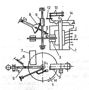Conform figurii 3.31 pe un miez magnetic 1, prevazut cu 2 poli pe care sunt plasate spirele ecran 3, se afla bobina de excitatie 2, parcursa de curentul din circuitul protejat. In intrefierul polilor circuitului magnetic se afla discul de aluminiu 4, al carui ax este sustinut de tija 5,care poate oscila in jurul axului O2. La obtinerea de catre curent a unei valori de (0,2÷0,3)·Ir, unde Ir este valoarea reglata a curentului, discul incepe sa se roteasca in jurul axului O1 cu turatie mentinuta constanta de cuplul de franare determinat de magnetul permanent 7. Daca intensitatea curentului prin releu depaseste valoarea reglata Ir, cuplul motor Mrot invinge cuplul rezistent dat de resortul antagonist 6 si are loc o rotatie a tijei 5de sustinere a discului in jurul axei O2. Se realizeaza astfel cuplarea rotii melcate 9 cu sectorul dintat 8 si odata cu rotirea discului se roteste sectorul dintat 8 in jurul axei O3, antrenand piesa 11 ce se ridica si atinge la capatul cursei piesa 12, care basculand in jurul axului O4 determina inchiderea contactelor 13. Functionarea instantanee a releului este determinata de atragerea armaturii feromagnetice 14 de talpa polara a circuitului feromagnetic 1 si prin rotatia ei in jurul axei O4 provoaca inchiderea contactelor 13.
