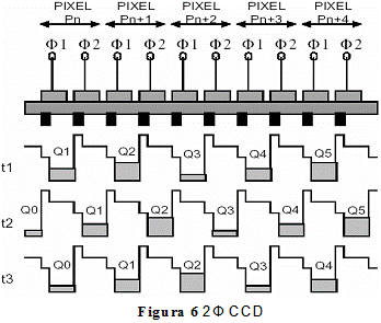 Pentru a defini un pixel prin aceasta tehnica se folosesc 4 astfel de electrozi - porti, asa cum este prezentat in figura 4. Pentru a forma o groapa de potential se aplica un potential pozitiv pe grilele Ф1 si Ф2 si negativ pe Ф3 si Ф4. Astfel se colecteaza electronii liberi corespunzatori pixelului P1 sub grilele Ф1 si Ф2. Daca ulterior potentialele se modifica astfel incat grila Ф1 este negativa, grila Ф2 pozitiva, grila Ф3 pozitiva si Ф4 negativa, sarcina corespunzatoare pixelului P1 este mutata sub griele Ф2 si Ф3.