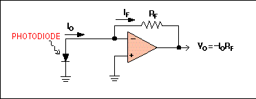 Un convertor I-U cu amplificator operational (Fig. 6) solutoneaza multe din aceste probleme. Tensiunea de iesire a operationalului va cobora fata de masa pana acolo unde curentul IF prin rezistenta de reactie RF egaleaza curentul fotogenerat Io , facand tensiunea din nodul sumator, intrarea '-', egala cu cea de la intrarea '+', 0V.