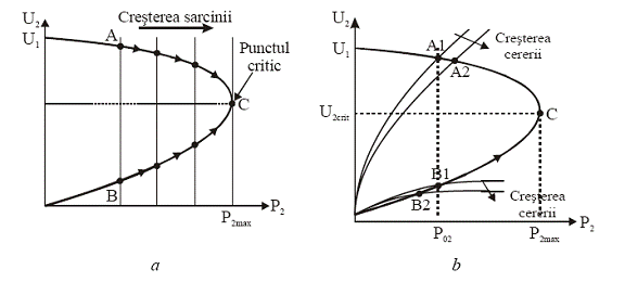 Astfel, in cazul unei sarcini de tipul P = ct., la cresterea cererii de putere, datorita deplasarii caracteristicii sarcinii, cele doua puncte de echilibru A si B se apropie unul de altul, se suprapun in punctul critic C (care constituie un punct singular ce coincide in acest caz cu punctul corespunzator puterii maxime transportabile) si apoi dispar.
