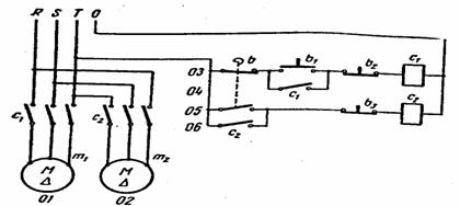 Pentru legarea la retea a motorului m1 se utilizeaza contactorul c1 iar pentru motorul m2 contactorul c2 (fig. 5). Prin actionarea manuala a butonului b1 se alimenteaza la retea bobina contactorului c1 si se inchid contactele c1 din circuitul 03, legand la retea motorul asincron m1. In acelasi timp se inchide si contactul c1 din circuitul 03 realizand mentinerea legarii la retea a bobinei ci si dupa incetarea actiunii asupra butonului b1. Cand organul pus in miscare de motorul m1 ajunge intr-o anumita pozitie actioneaza limitatorul de cursa deschizand contactul normal inchis b (circuitul 03) si inchizand contactul normal deschis b (circuitul 05). Prin aceasta se deconecteaza de la retea bobina contactorului c1 alimentandu-se bobina contactorului c1. Astfel se opreste motorul m1 (se deschid contactele c1) si se porneste motorul m2 (se inchid contactele c2). Memorarea comenzii se realizeaza cu ajutorul contactului c2 din circuitul 06.