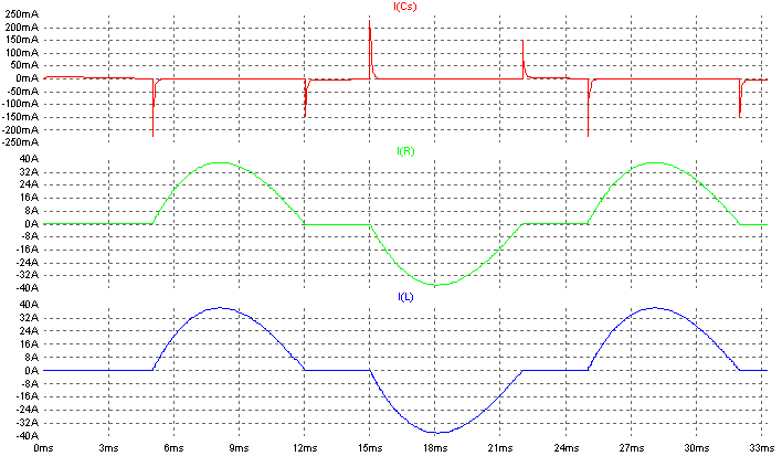 Si in acest caz se poate observa defazajul care apare la intrarea in conductie a tiristoarelor.
