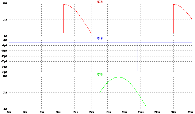 Se poate observa defazajul intre pulsurile generate in grilele celor 6 tiristoare.Amplitudinile curentilor, cat si unghiul de comanda a celor 6 tiristoare sunt egale.