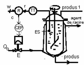 Ca exemplificare este prezentata schema de reglare a temperaturii intr-un reactor cu manta, la care marimea de executie este debitul agentului de racire.
