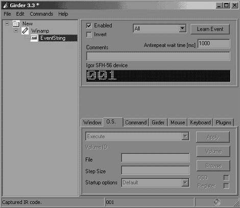 Apasati butonul OK si Girder este gata de rulare. Acum trebuie sa spuneti lui Girder ce sa faca daca apasati un buton pe telecomanda. Selectand Edit Add Command, apare pe fereastra lui Girder o comanda cu numele "New". Sa presupunem ca vreti sa porniti Winamp cu butonul 1 de pe telecomanda. Selectati tabul O.S. si din lista de comenzi "Execute", apasati butonul "Browse" si cautati executabilul Winamp.exe. Dupa ce l-ati gasit, apasati butonul "Open". In casuta "File" apare calea Winamp-ului (ex: C:Program FilesWinampWinamp.exe). Apasati butonul "Apply". Acum ca Girder stie ce sa faca, trebuie sa-l invatati sa faca acest lucru cand apasati butonul "1" pe telecomanda. Apasati butonul "Learn Event", butonul se transforma in "Cancel Learn" si in bara de status apare "Waiting for IR code.", apasati butonul "1" pe telecomanda. Apare un "Eventstring" sub numele comenzii (New), in bara de status "Captured IR code.", si pe afisajul matrix apare codul IR (ex: 001). Daca doriti atunci renumiti comanda "New" (click dreapta pe comanda si "Rename"). Daca vreti ca comanda sa fie executata doar o data, atunci selectati evenstringul aparut si in casuta "Antirepeat wait time [ms]" scrieti "1000". Inchideti fereastra Girder apasand pe "X" din coltul dreapta sus a ferestrei (si nu File Exit Girder), fereastra este minimizata in tray. Acum daca apasati butonul "1" pe telecomanda atunci Winamp ar trebui sa porneasca daca nu porneste inseamna ca nu a-ti facut cele de mai sus cum trebuie. Procedati similar cu orice comanda pe care doriti sa o programati in Girder.