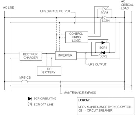 c) in regim de intretinere a intreruperii circuitului. Un intrerupator de circuit bypass alimentare bypass. este pregatit sa opreasca complet sistemul UPS-ului, atunci cand alimentarea acestuia este intrerupta. Linia bypass asigura alimentarea continua pe timpul in care un modul al UPS-ului are o disfunctie. Daca disfunctia este de natura sa intrerupa alimentarea UPS-ului, atunci incarcarea trebuie schimbata pe linia de bypass.