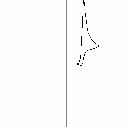 In Fig. 7a este prezentata o voltamograma ciclica pentru o astfel de reactie, la o viteza de variatie mica (0.1V/s) iar in Fig. 7b este prezentata aceeasi reactie supusa voltametriei ciclice la o viteza mare (3.6V/s). Din alura curbelor se poate observa la viteza mare inhibarea procesului secundar nedorit A → B cu constanta de viteza de reactie komogen = 1: