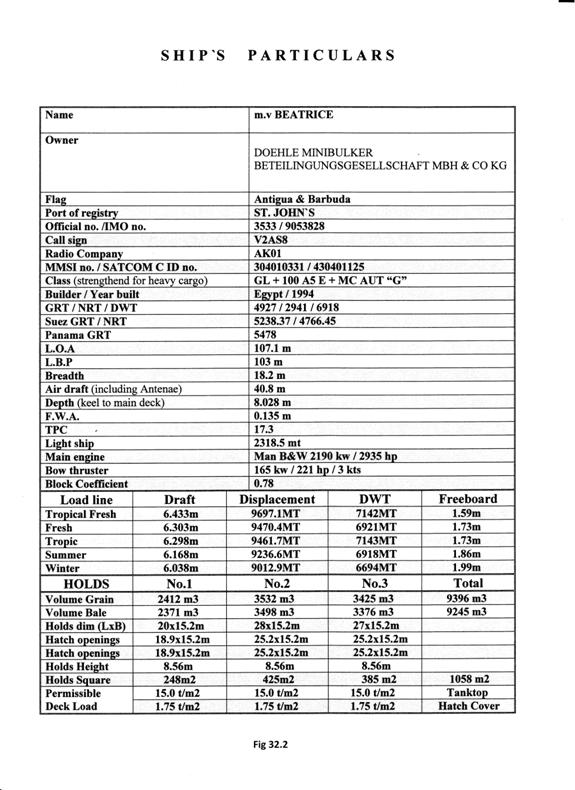 Încarcarea in magazia numarul 1 a fost efectuata de pe bordul de la mare , acolo aducandu-se o macara plutitoare, iar marfa livrata cu ajutorul unei barje. Determinarea cantitatilor de marfa de bordul navei au fost efectuate in aceleasi conditii cand la bordul dinspre apa nu era legata nici macaraua si nici barja.