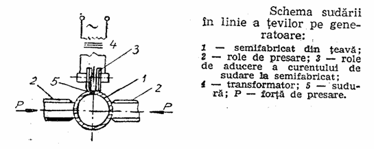 Banda de otel, dupa ce este transformata intr-un semifabricat de teava 1, este introdusa intre doua role de presare 2, iar prin rolele 3 de la partea superioara se introduce curentul de sudare. Prin dezvoltarea caldurii si presarea rolelor se obtine cusatura la partea superioara. Cu aceasta schema se sudeaza tevi din otel carbon si slab aliat cu grosimea peretului intre 0,5 si 2 mm.