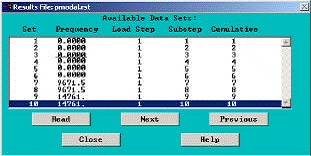 Modelul cu elemente finite a fost realizat cu elemente finite de tip paralelipipedic, utilizarea acestora micsorand substantial erorile de calcul. Lista primelor valori ale frecventelor proprii pentru patina analizata sunt prezentate in fig. 13. Din nou primele sase valori sunt nule deoarece nu s-au impus conditii pe contur (blocaje) si aceste valori reprezinta cele sase grade de libertate mecanice ale solidului rigid.