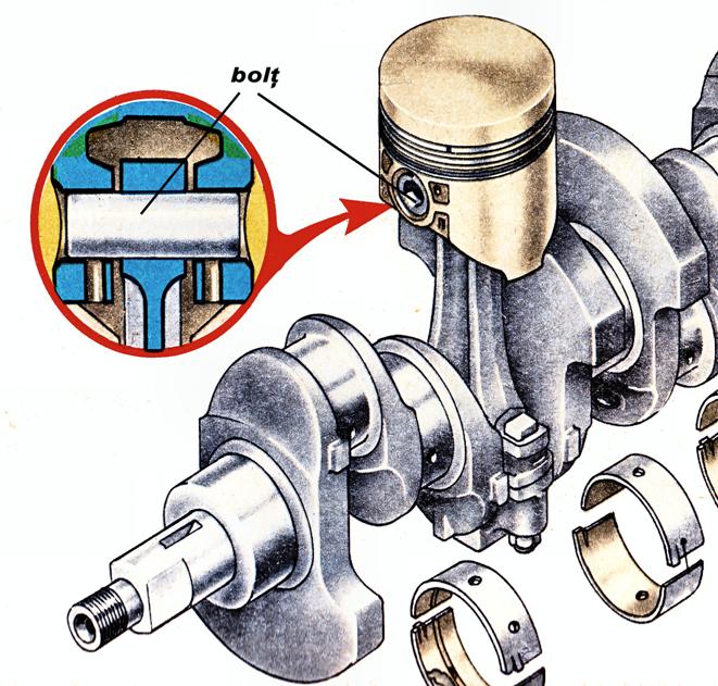 Pentru a diminua considerabil zgomotul provocat de piston la schimbarea sensului de miscare in zona punctului mort superior (p.m.s.) axa alezajelor boltului se dezaxeaza fata de planul de simetrie al pistonului ca in figura 14.