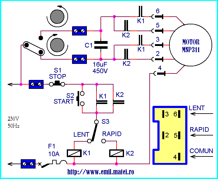O schema tipica de conectare a acestui motor intr-o masina de spalat automata, comanda acestuia fiind realizata prin intermediul unui programator electromecanic este urmatoarea: