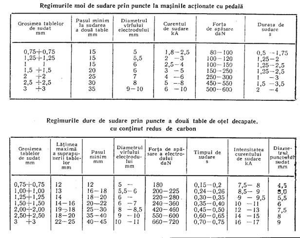 In tabele se dau regimurile de sudare prin puncte ale tablelor de otel decapate cu continut redus de carbon, cu regimuri de sudare moi si dure.