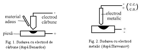 Dupa descoperirea arcului electric de catre V. V. Petrov (1802), N.N. Benardos (1882) il aplica la sudarea metalelor, folosind un electrod de carbune alimentat in c.c. (fig. 1.).