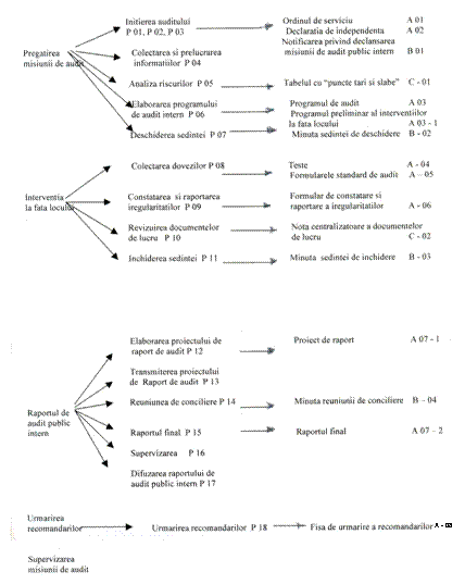 b) Derularea misiunii de audit public intern poate fi redata in graficul prezentat mai jos, care ofera o viziune globala asupra procesului de audit public intern. În partea stanga a graficului sunt prezentate etapele procesului de audit public intern, cu referire la procedurile de urmat, iar in partea dreapta rezultatele obtinute cu referire la documentele corespunzatoare.