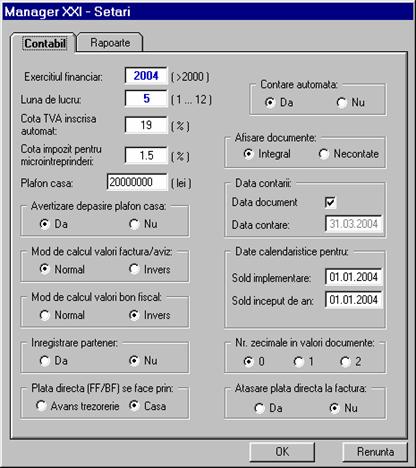 d) setarea exercitiului financiar de lucru - faza "Contabilitate -> Setari" (cap.6.13), "Salarii -> Setari" (cap.7.7) sau "Gestiune -> Setari" (cap.8.9), in functie de modulul de executat (cele doua setari pot fi diferite);