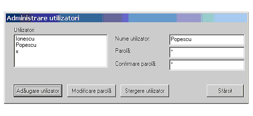 a) Adaugare utilizator - se precizeaza numele, parola si apoi se apasa pe buton; numele nou introdus va apare in lista din stanga;