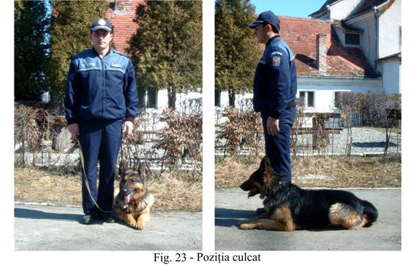 Apoi, conductorul si cainele pornesc, din pozitia de baza, pe latura 1, iar in dreptul punctului B, la comanda, pune cainele in pozitia culcat. Il lasa in aceasta pozitie, continuandu-si deplasarea pana in punctul A, unde, se intoarce cu fata spre caine si se opreste. La semnalul evaluatorului, cheama cainele. Acesta vine rapid si se aseaza in fata conductorului, dupa care, la comanda, este chemat in stanga acestuia. Conductorul, impreuna cu cainele, porneste inspre punctul S, unde, se opreste cu cainele in pozitia asezat (Fig. 37).