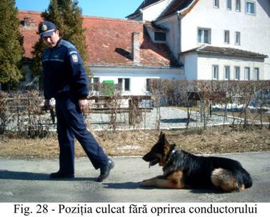 evaluatorului, se intoarce la caine, se aseaza in dreapta acestuia,