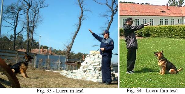 De asemenea, cainele nu va fi lovit, sub nicio forma, cu mana sau lesa (Fig. 5). El trebuie sa invete sa se simta in siguranta in preajma conductorului si sa considere mainile acestuia un simbol al afectiunii si nu un instrument de corectie. In aceeasi masura, lovirea cainelui cu lesa nu va face altceva decat sa provoace animalului teama fata de aceasta si o diminuare a efectului ei atunci cand este folosita corect.
