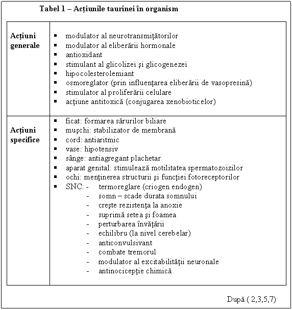 Ca urmare a acestor cercetari s-a dovedit implicarea taurinei in numeroase procese biofizice, biochimice si fiziologice din organismul uman. Deoarece nu este un obiectiv al acestei lucrari prezentarea detaliata a acestora, ele sunt prezentate schematic in tabelul 1 care reproduce (cu completarile autorilor) date din materialul mentionat mai sus.