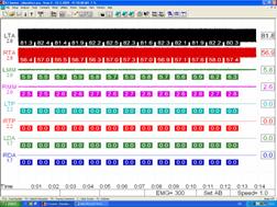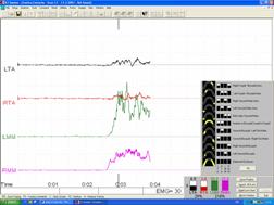 Pe diagramele afisate pe display-ul computerului apar si valorile amplitudinilor contractiilor musculare de la nivelul muschilor maseteri si fasciculele anterioare ale temporalilor. Sub coloanele care materializeaza valorile amplitudinilor contractiilor sunt afisate diferentele dintre valori in procente. Producatorul considera ca la valori sub 25% muschii sunt considerati a avea acelasi grad de contractie inalt sau redus, depinde cum apare marcata coloana colorata. Procentele peste 25 % sugereaza ca amplitudinile pe partea stanga comparativ cu cea dreapta sunt in registre diferite, respectiv amplitudini una inalta si una joasa. Urmarind tiparul inscris se poate cauta pe diagram cu bilantul ocluzal tiparul inregistrat cu stabilirea contactelor existente. La nivelul intregului lot 73 % au prezentat diagrame de tipul urmator: