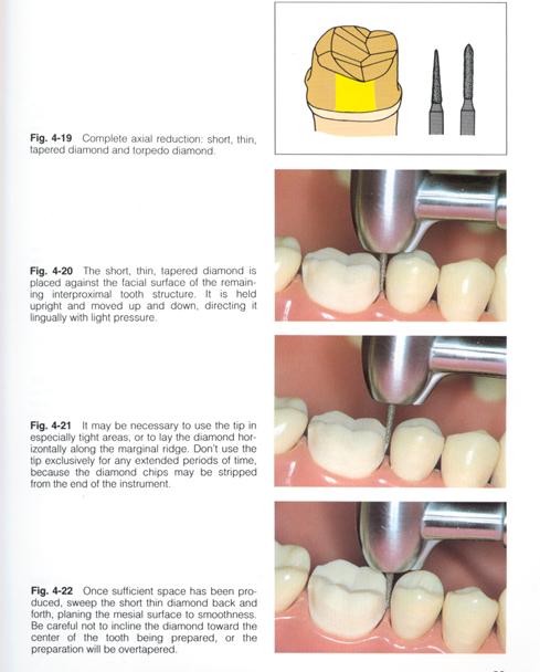 Tehnica: se realizeaza cate un sant de ghidaj la 0,5mm de punctul de contact si uneori si pe mijlocul fetei vestibulare- piatra orientata paralel cu axul dintelui se afunda in substanta dentara pe jumatate din diametrul sau. Apoi , prin miscari de pensulare, cu piatra diamantata tangenta la convexitatea maxima a fetei si paralela cu axul dintelui, se reduce substanta dentara dintre santuri. La periferia cervicala, in acelasi timp cu derentivizarea si obtinerea spatiului pentru peretele coronar, se va evidentia un prag rotunjit de 0,5mm.