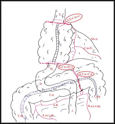 Repunerea duodenului in circuitul digestiv, dupa gastrectomiile totale, prin interpunerea intestinului gros (colonul transvers) intre bonturile esofagului si duodenului unu - Procedeul lui Moroney (Fig.22.). Procedeul constituind si gastroplastia - inlocuirea stomacului rezecat total.